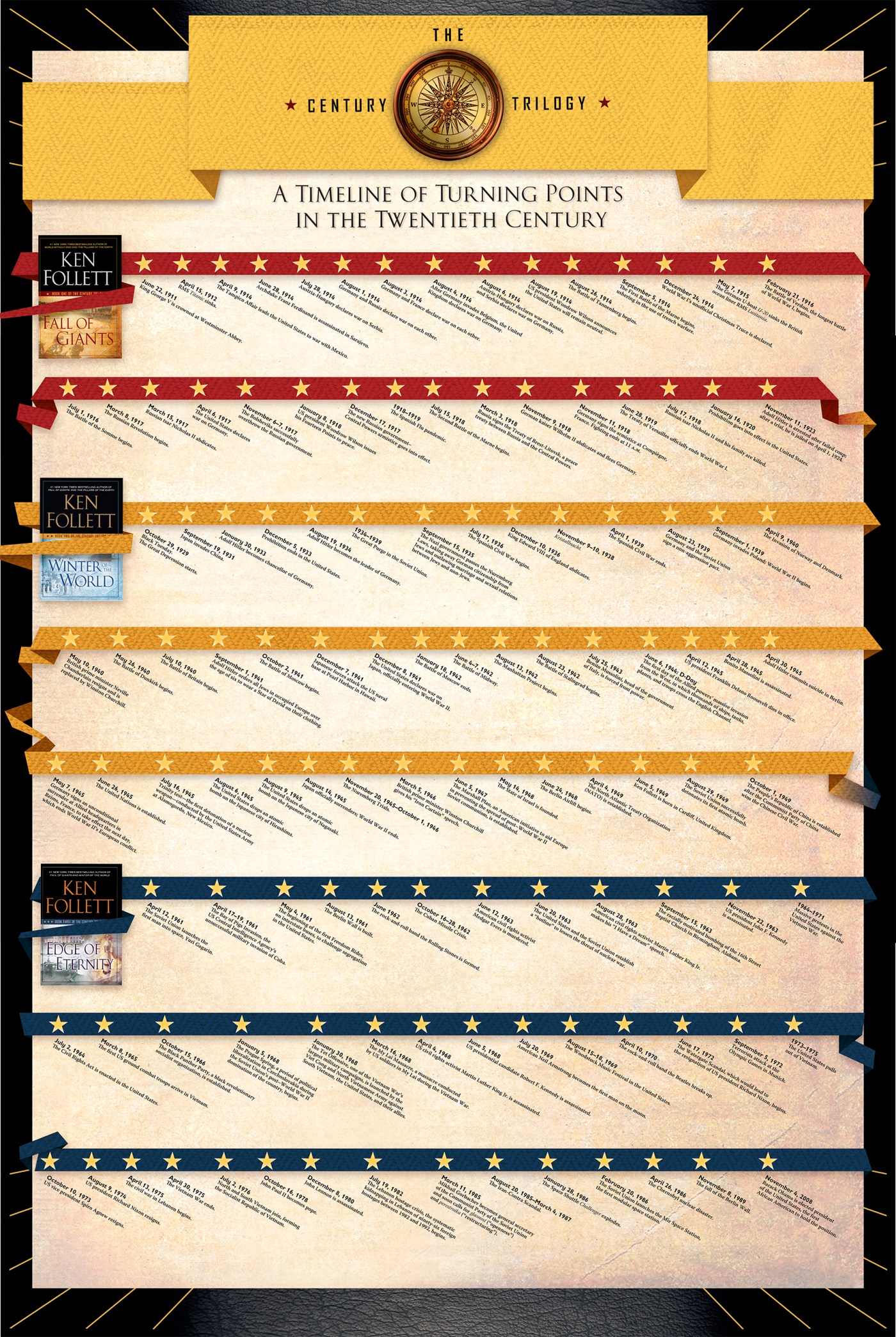 Timeline for one side of a double-sided poster, to be included in a boxed set for Ken Follett’s Century Trilogy. Designed for Dutton Imprint, Penguin Group.