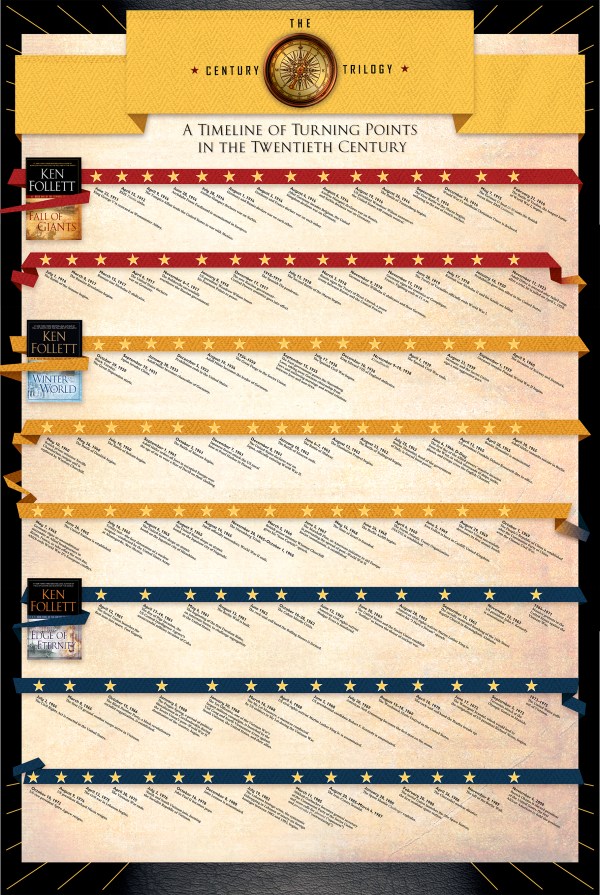 Timeline for one side of a double-sided poster, to be included in a boxed set for Ken Follett's Century Trilogy. Designed for Dutton Imprint, Penguin Group.